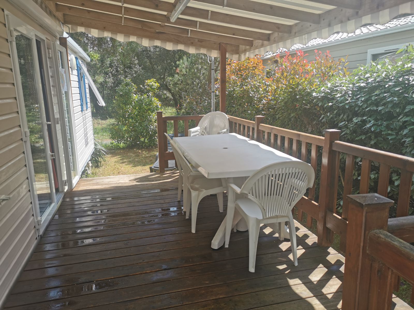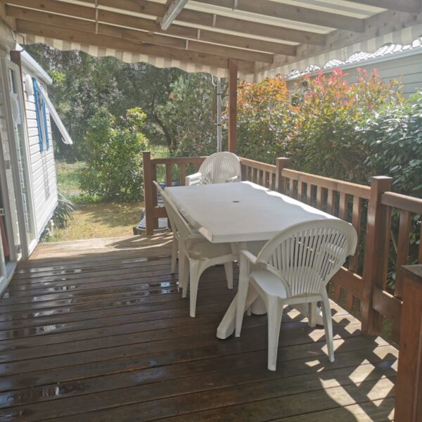 A bright new modern 3 bedroom mobile home with air conditioning located in a quiet area on a private pitch yet only a 5 minute walk to the pool complex. The mobile comprises of a central lounge, dining area with TV (French and English channels), a fully equipped kitchen and two bathrooms and a washing machine. Outside there is a covered wooden terrace leading to a sunny garden.